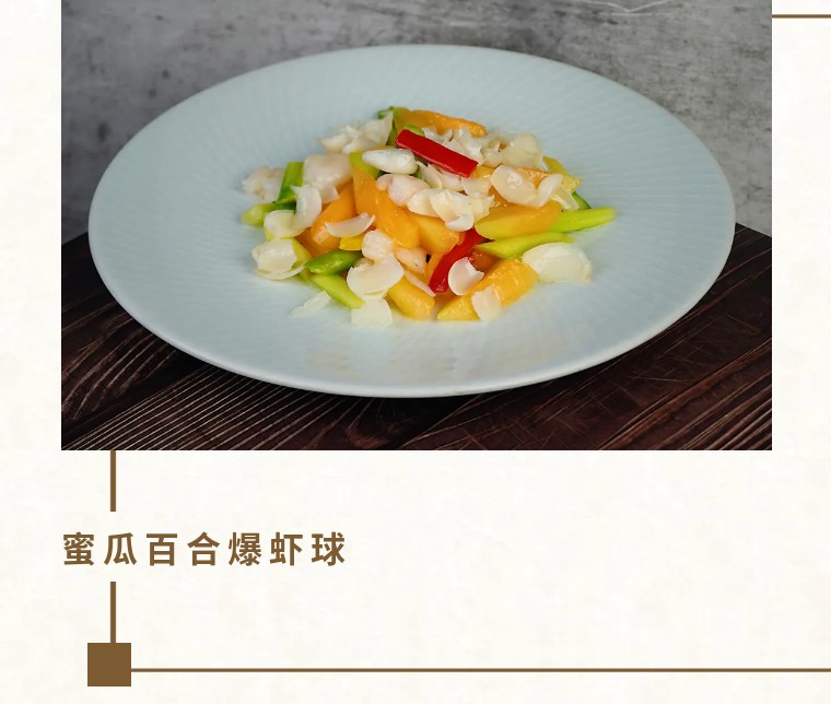 精选大颗饱满虾仁,加入当季脆甜蜜瓜与洁白清润的鲜百合,光是色彩就让人眼前一亮。一口下去,鲜嫩多汁的口感在口腔中迸发,带来清爽的味觉体验,仿佛将整个夏天的甜蜜与清新都汇聚在这一盘佳肴之中。