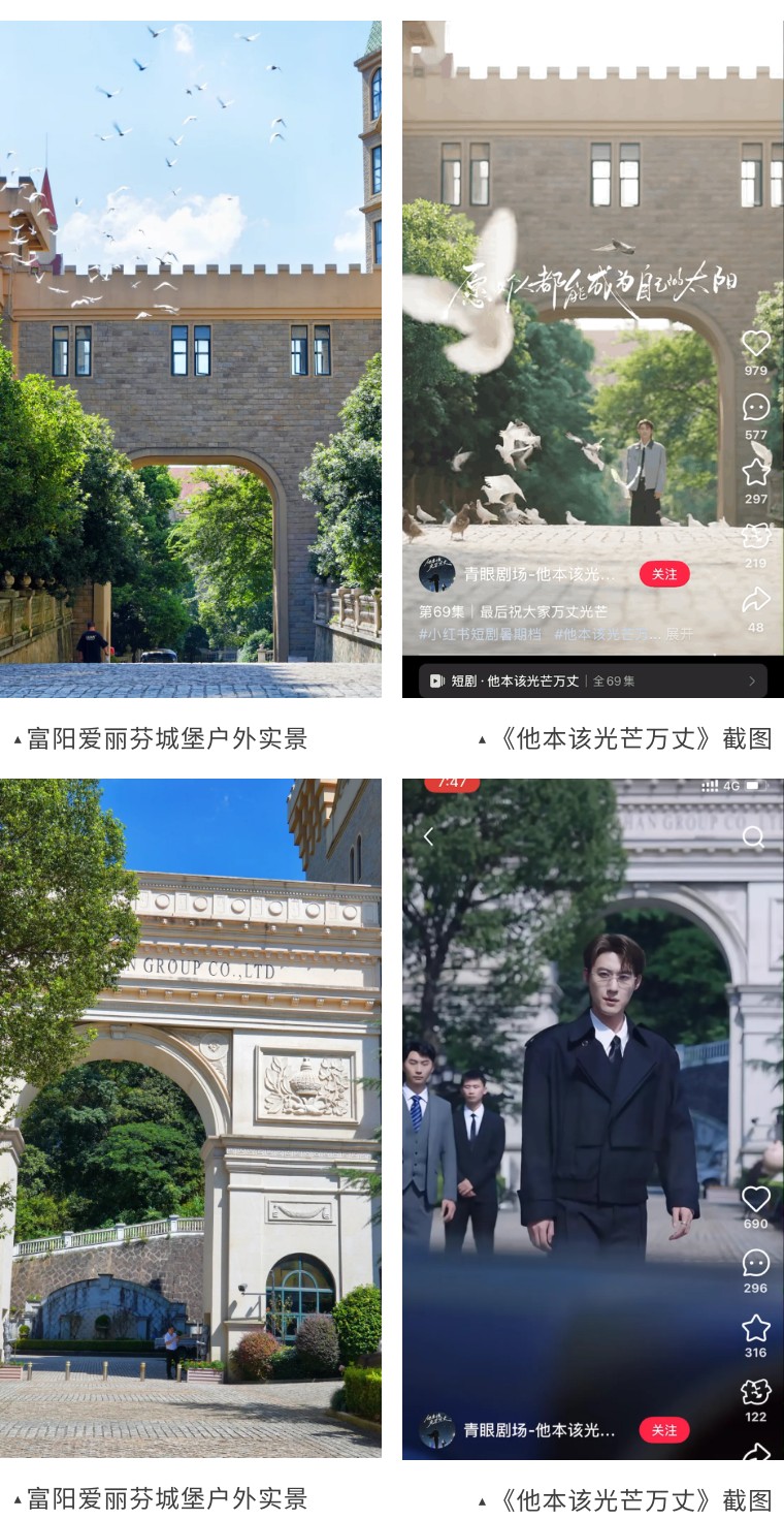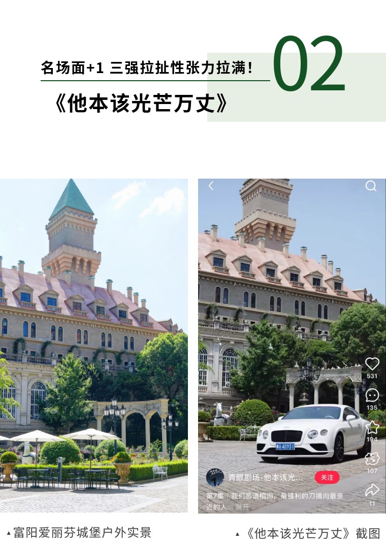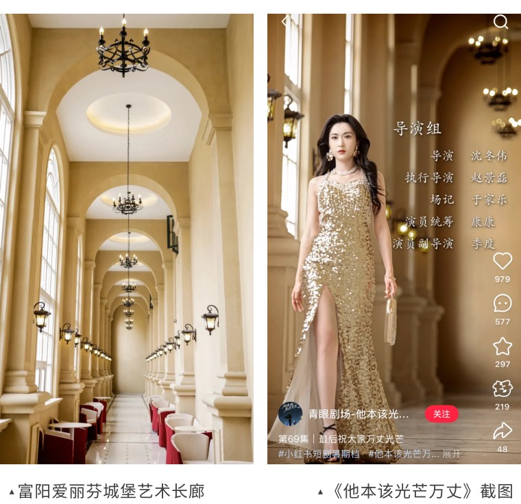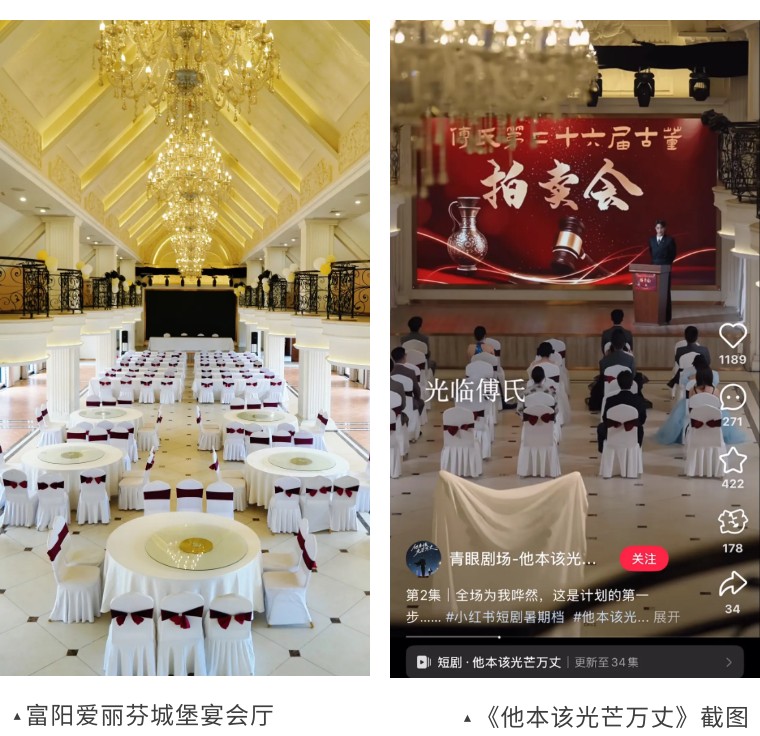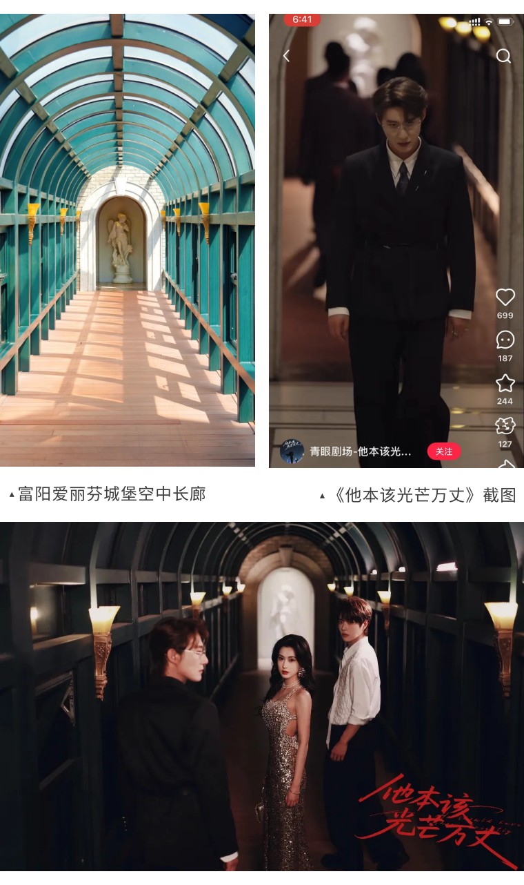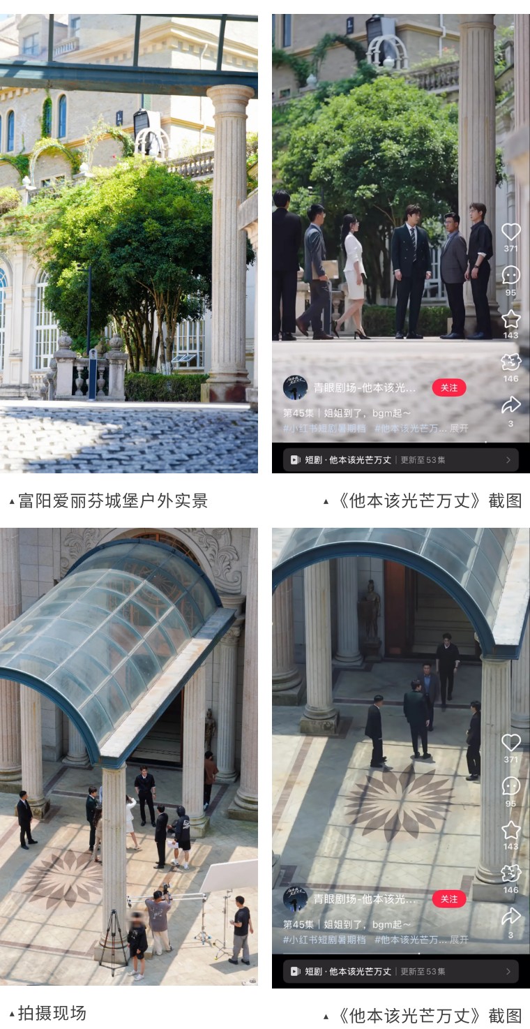 在刚上映的短剧《他本该光芒万丈》中,富阳爱丽芬城堡变身为豪门“傅家”的宅子,欧式城堡建筑与做古董修复/拍卖生意的傅家完美适配。