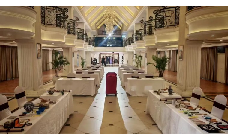 剧中最重要的拍卖会场景,取景于富阳爱丽芬城堡大酒店的宴会厅。独特的长纵深宴会空间,水晶吊灯与墙面浮雕装饰,奢华大气。