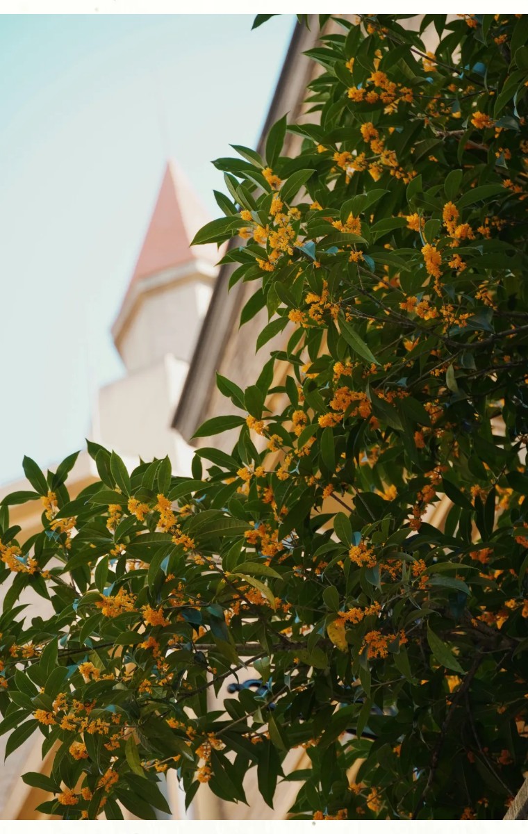 🌼桂香漫城:一簇簇金桂、银桂如繁星点点,掩映在古朴的城堡砖墙与绿意之间。与好友漫步其间,在馥郁的桂花香中闲话家常,随手拍一张“城堡+桂树” 的合影,复古又雅致。