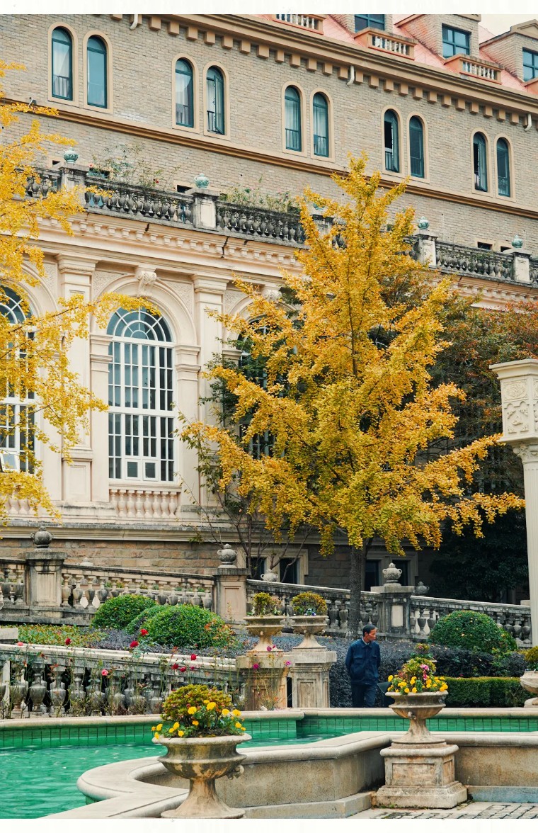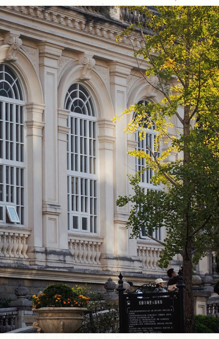 傍晚时分,夕阳洒在银杏树上,连城堡的欧式尖顶都染上暖光,美到让人驻足。