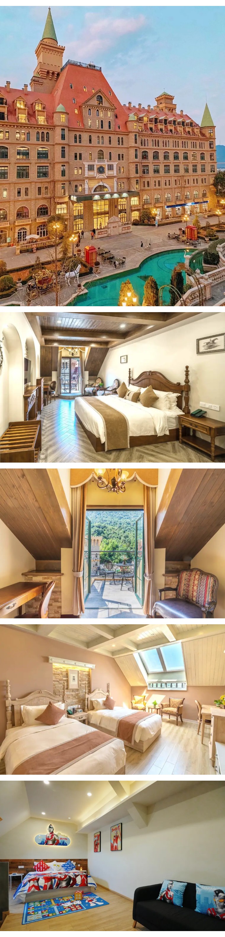 酒店设计有多种房型,可满足亲子、情侣、朋友等不同的出行需求;部分房型配备观景阳台,推窗即可望见城堡景致,居住体验兼具舒适与浪漫。