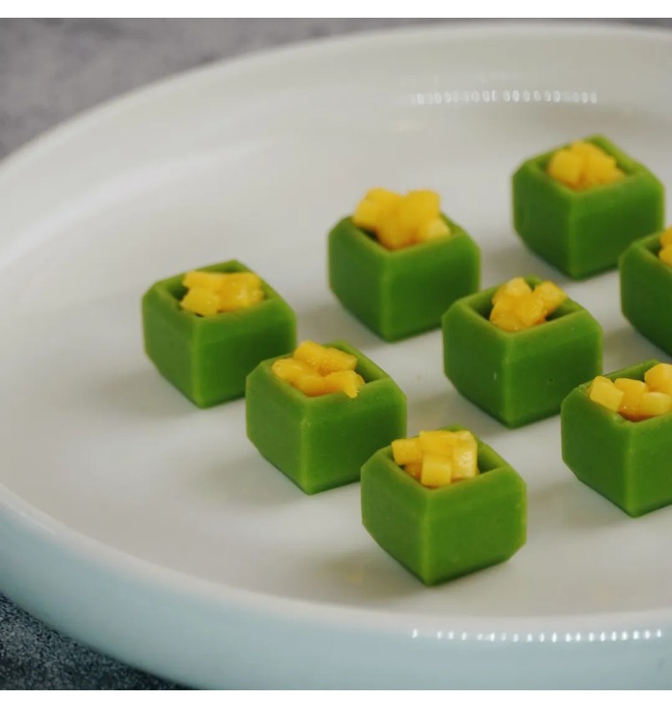 打破传统青豆吃法!陈皮的甘醇清香融入丝滑的奶油青豆冻中,中西合璧,口感绵密清新,风味独具一格。