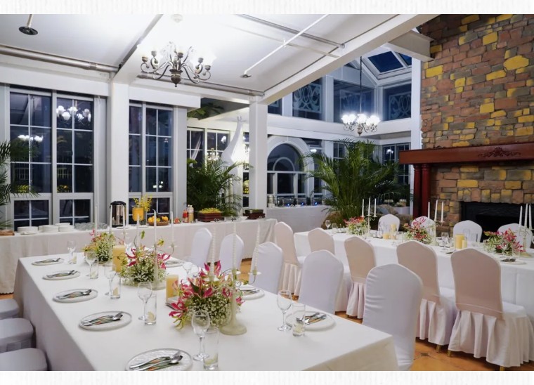 场地可容纳约150人,灵活设置圆桌聚餐或自助茶歇模式。复古真火壁炉与精致餐桌营造出归家般的温暖,特别适合中小型企业的年度复盘会与团队答谢宴。