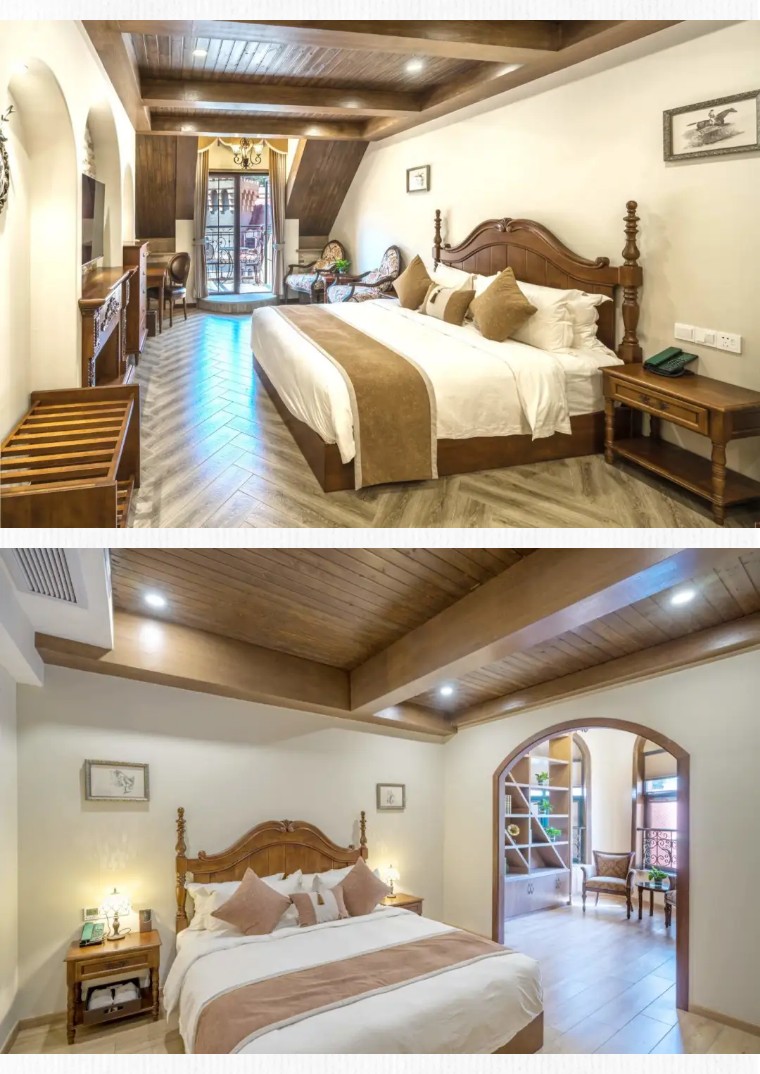 城堡大酒店延续欧式复古风格,配备豪华标间、行政套房等多种房型,部分房间内设有景观阳台,总览城堡美景。