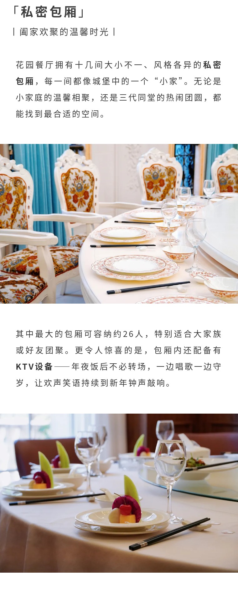 爱丽芬城堡大酒店·花园餐厅为你承包所有繁琐,用一场无需操劳的温情盛宴。在浪漫典雅的城堡氛围中,与家人围坐一桌,品尝珍馐美味,畅谈过往点滴,开启一场充满欧式风情却又年味十足的新年盛宴。
