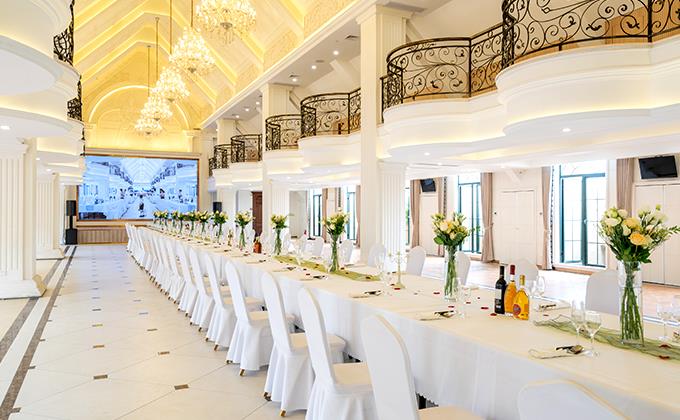 设计以白色、粉色为主,与城堡的浪漫相交呼应。一楼大厅拥有20张小餐桌、6个包厢, 共可容纳140余人同时用餐;二楼格局开阔,可承办200余人的宴席。